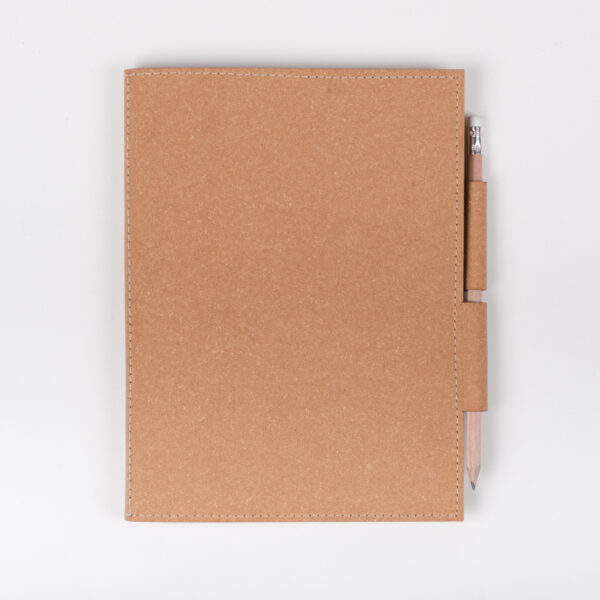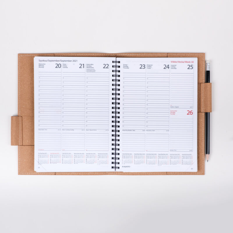 Hyvin aukeava kierresidottu kalenteri uusionahkakansilla ja kynälukituksella, takakannessa Private Case -preeglaus.