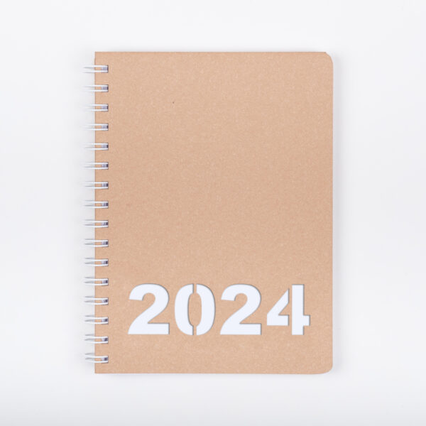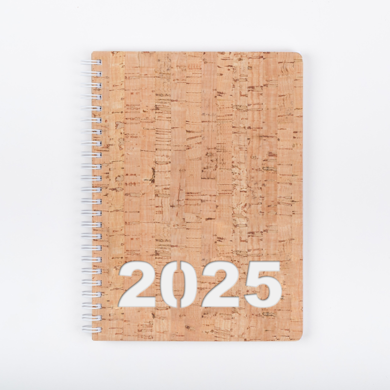 Hyvin aukeava kierresidottu kalenteri joko uusionahka- tai luonnon korkkikansilla valintasi mukaan, takakannessa Private Case -preeglaus.